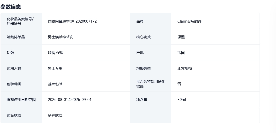 娇韵诗焕活神采乳液保湿滋润补水清爽润肤男士系列的描述