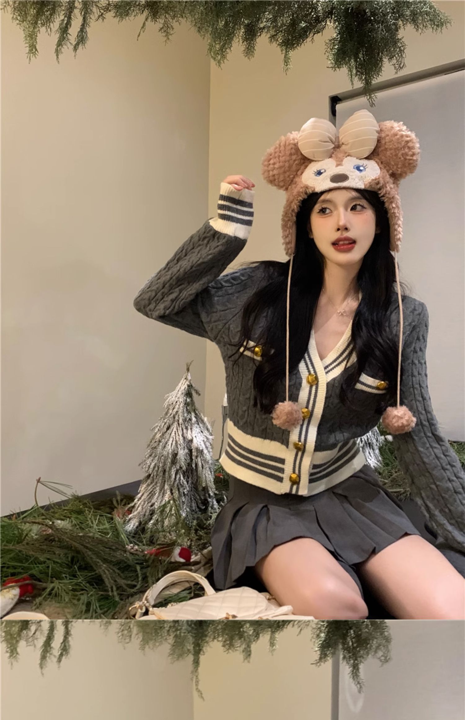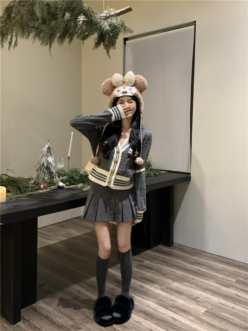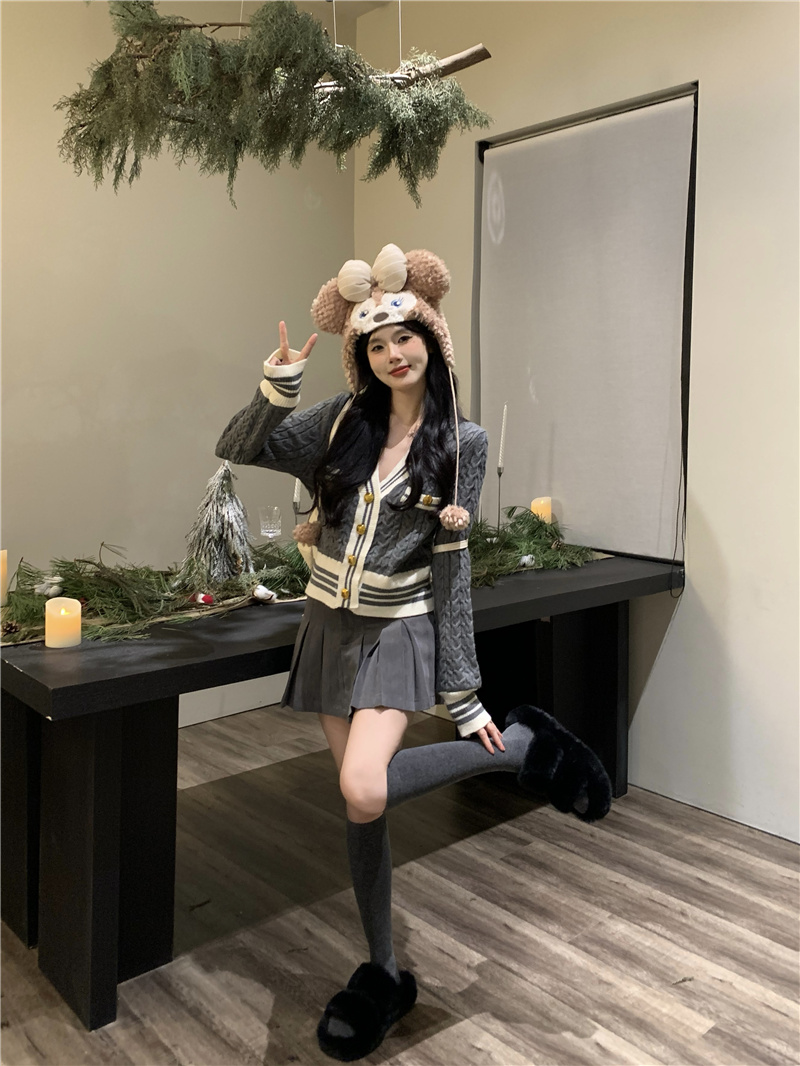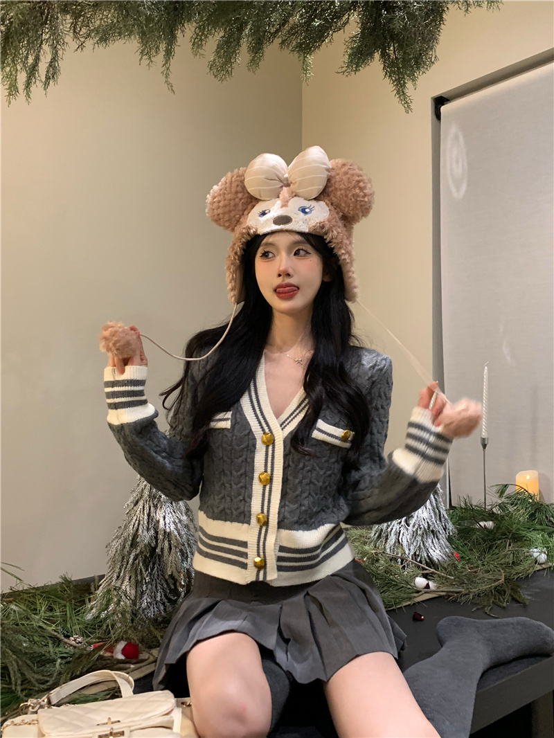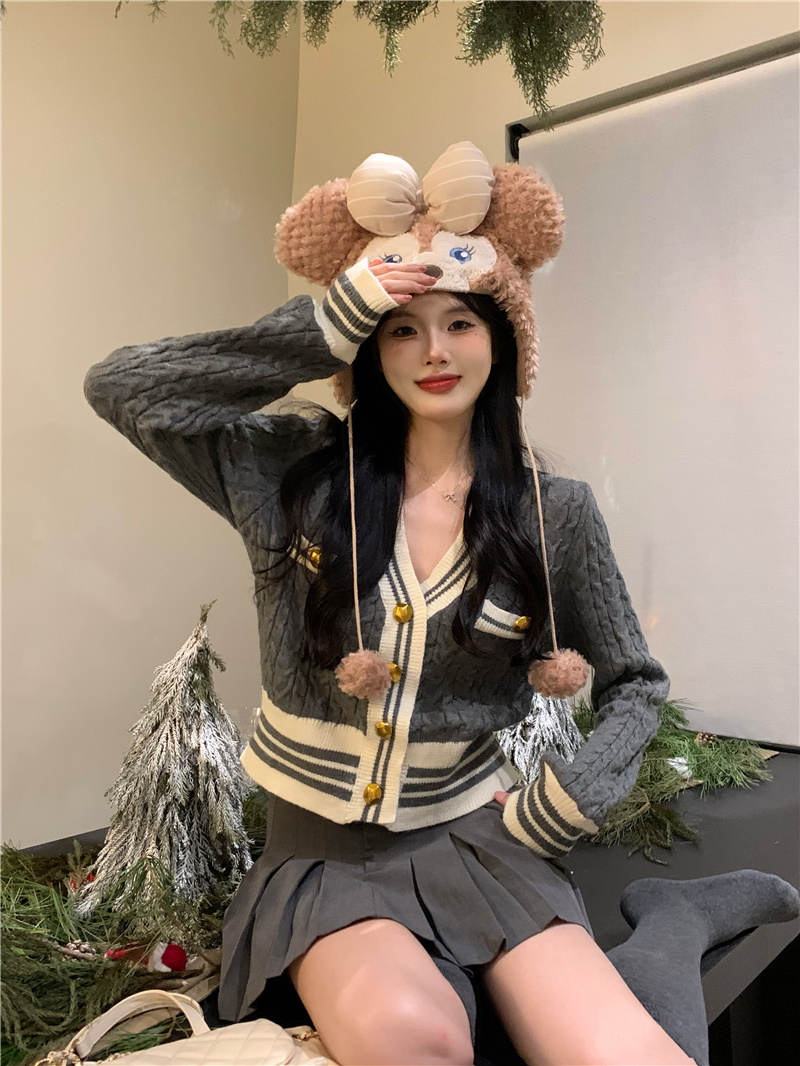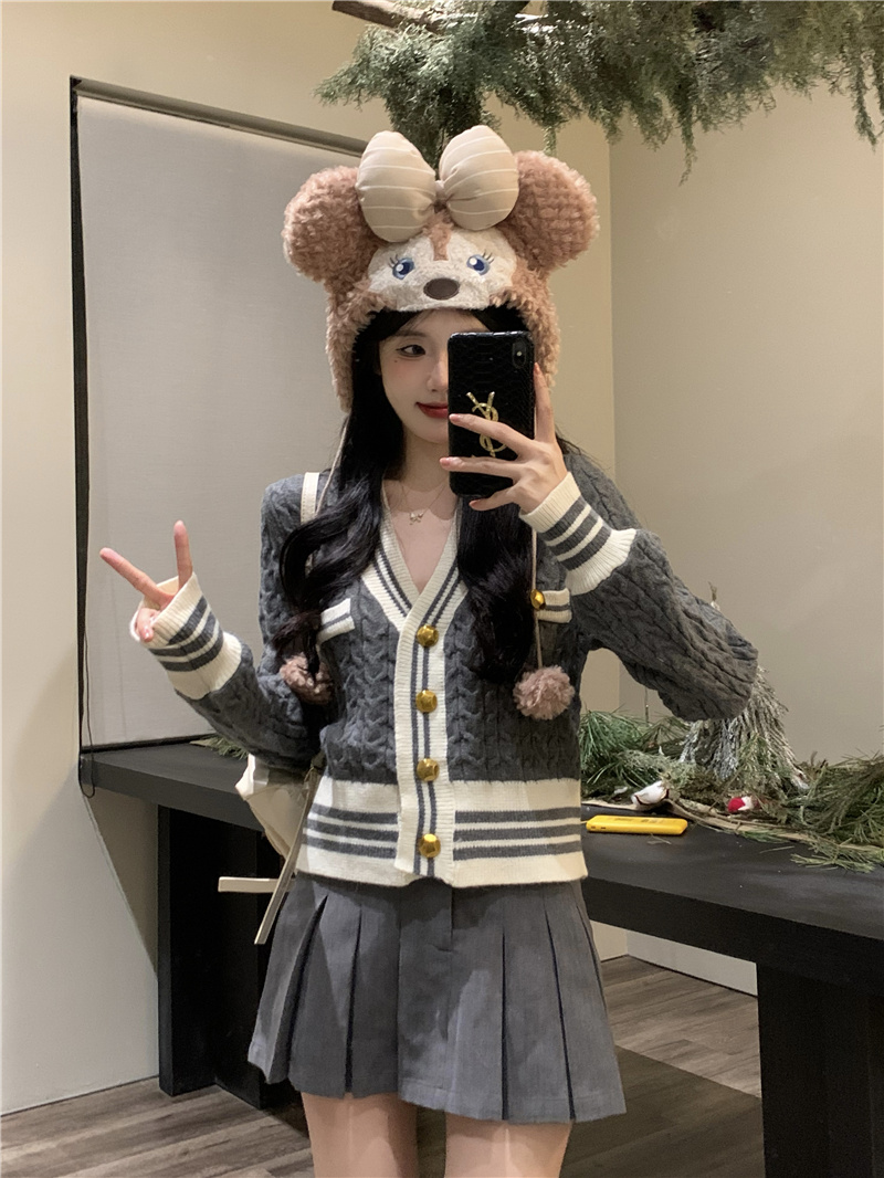 韩版灰色小香风麻花针织开衫女v领毛衣新款外套短款长袖上衣秋季